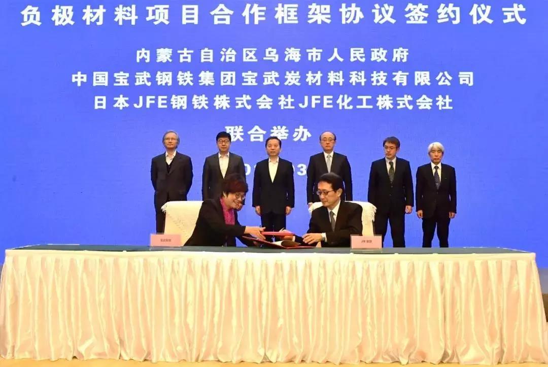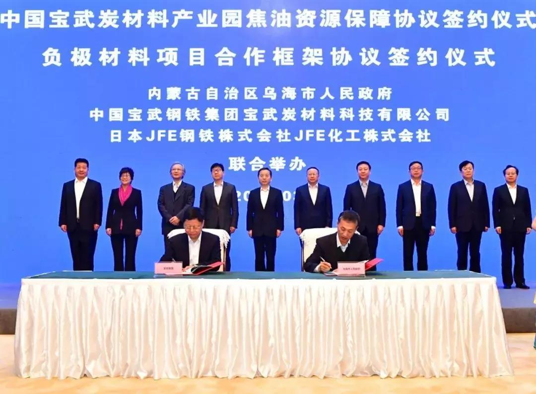 烏海市副市長包野與寶武炭材總經(jīng)理徐同建代表雙方在焦油資源保障協(xié)議上簽字。寶武炭材黨委書記、董事長林秀貞與JFE化工社長鈴木彰代表雙方在3萬噸鋰電池負極材料項目合作框架協(xié)議上簽字。