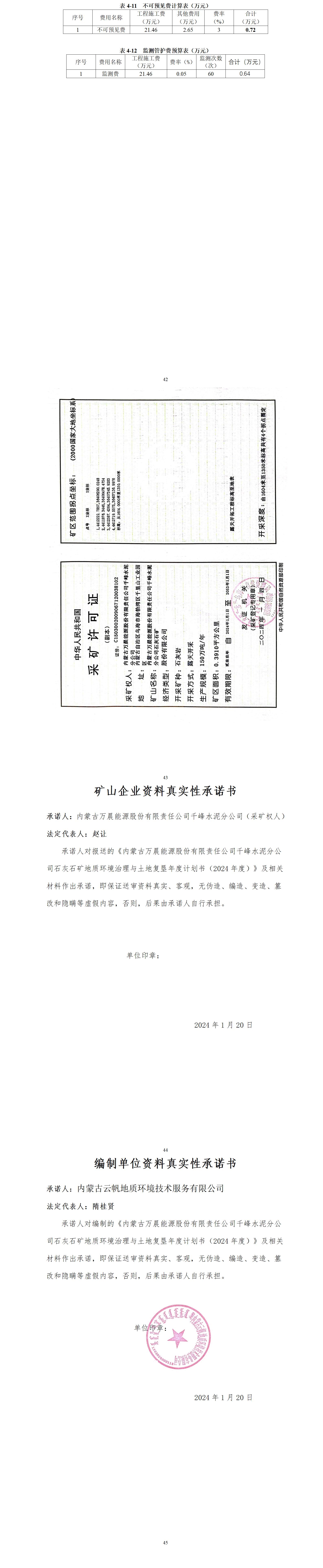內(nèi)蒙古萬晨能源股份有限責任公司千峰水泥分公司石灰石礦 地質(zhì)環(huán)境治理與土地復墾年度計劃書 (2024年度)